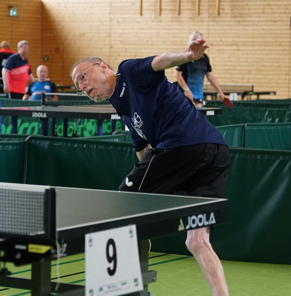 Noch spannender verlief hingegen das anschließende Kampfspiel im Halbfinale gegen den motivierten Vize-Europameister von 2022 Gerd Werner (TuS Rheydt Wetschewell). Pfeilschnell unterwegs, manchmal auch im Tiefflug die Angriffsbälle erobernd und jede sich bietende Chance mit einem Feuerwerk an Schmetterbällen nutzend, entnervte der „Hexer“ den permanent angreifenden Werner, im Finale und siegte am Ende mit 3:0 Sätzen.