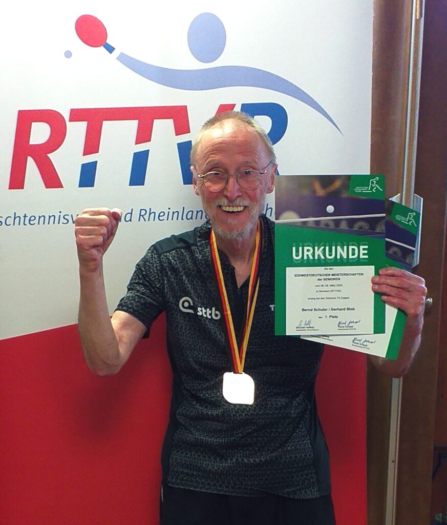 Über ein erfolgreiches Wochenende freut sich Bernd Schuler. Nach dem Sieg bei der Saarlandmeisterschaft wurde der Tischtennisspieler aus Ernst in Simmern auch Südwestdeutscher Meister Seniorenklasse Ü 75 im Einzel und im Doppel.