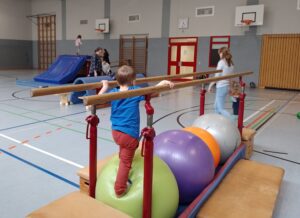 Immer dabei sind Bauchschaukel, Bälle, und Tücher. Um die Kinder spielerisch mit den Turngeräten vertraut zu machen und ihre Fähigkeiten zur Balance, Koordination und Konzentration zu fördern, bauen wir verschiedene Gerätelandschaften auf. Dabei haben die Kinder mit ihren Müttern / Vätern / Omas / Opas viel Spaß, erweitern ihre Fähig- und Fertigkeiten und erleben ein ganz neues Körpergefühl.