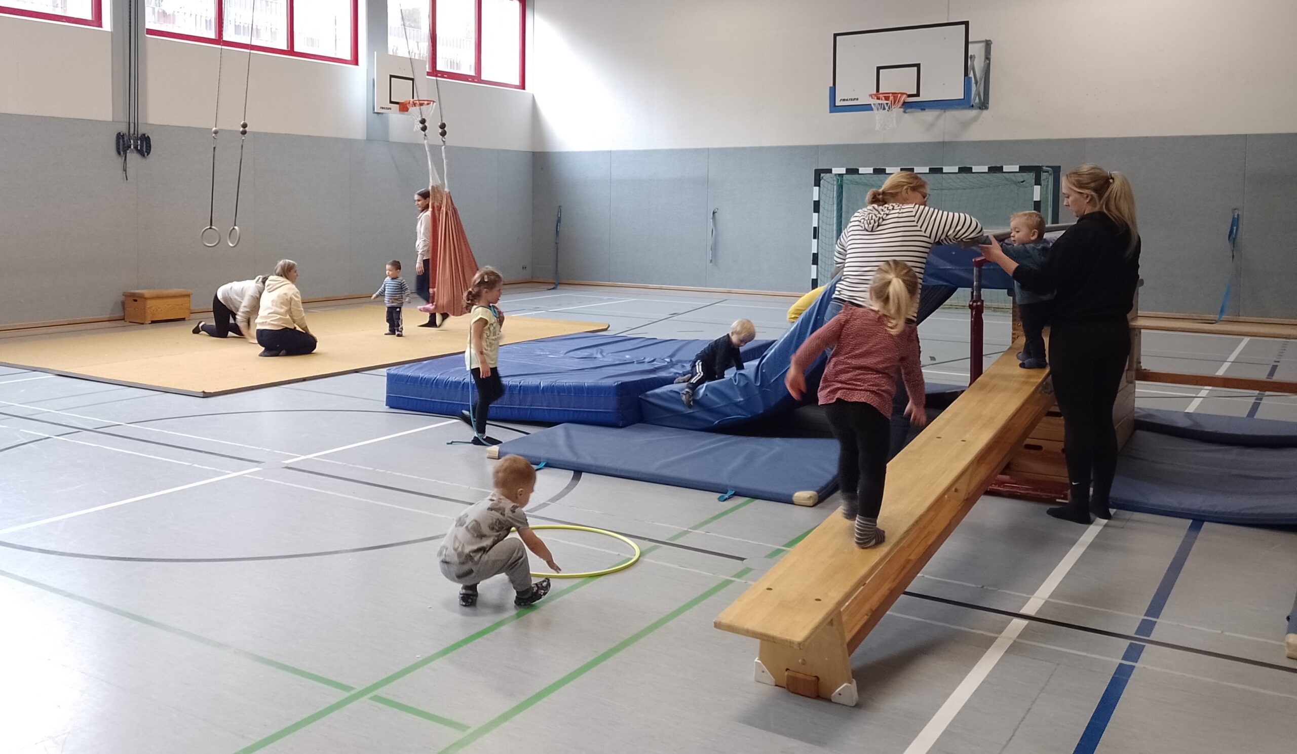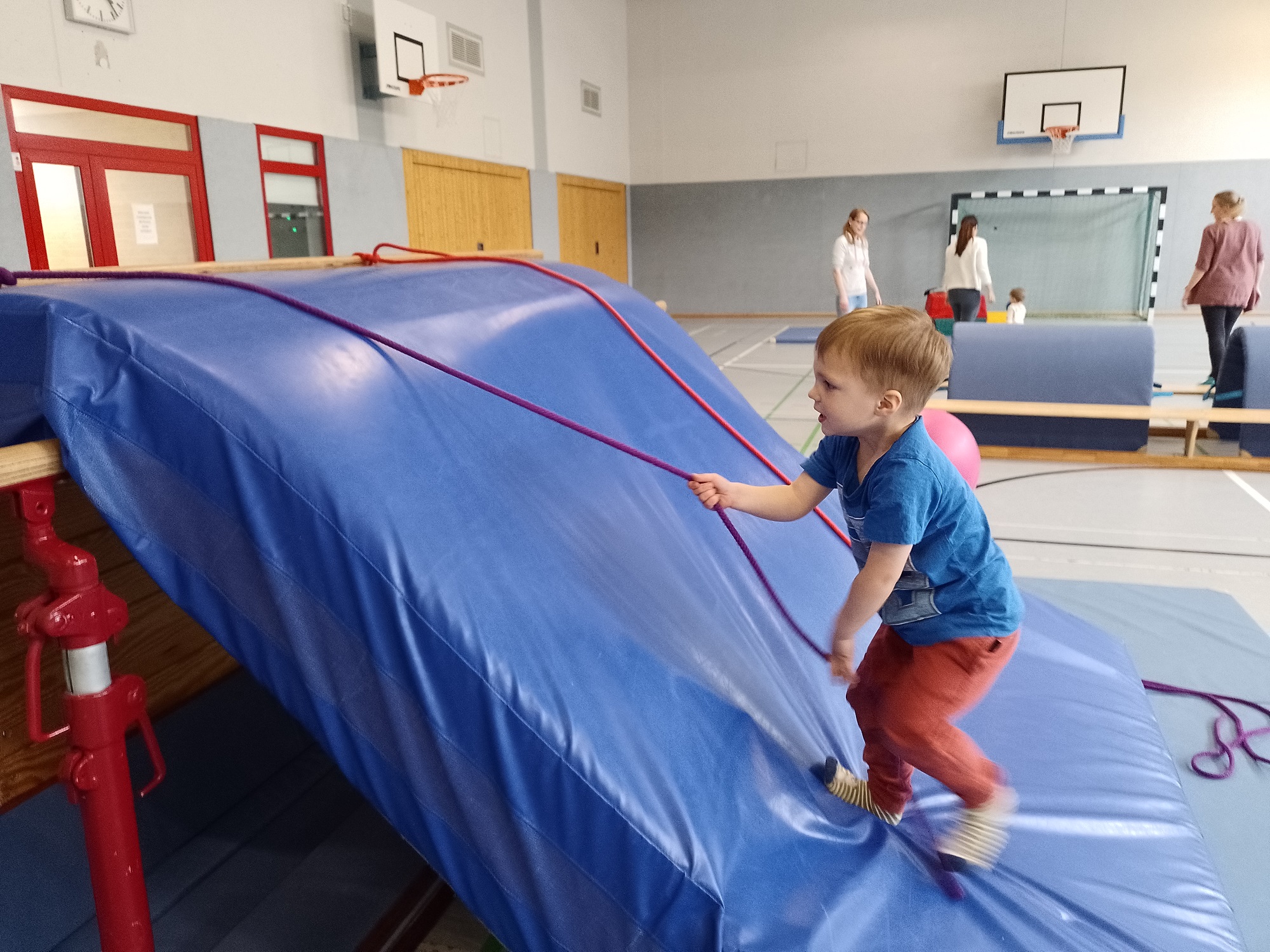 Immer dabei sind Bauchschaukel, Bälle, und Tücher. Um die Kinder spielerisch mit den Turngeräten vertraut zu machen und ihre Fähigkeiten zur Balance, Koordination und Konzentration zu fördern, bauen wir verschiedene Gerätelandschaften auf. Dabei haben die Kinder mit ihren Müttern / Vätern / Omas / Opas viel Spaß, erweitern ihre Fähig- und Fertigkeiten und erleben ein ganz neues Körpergefühl.