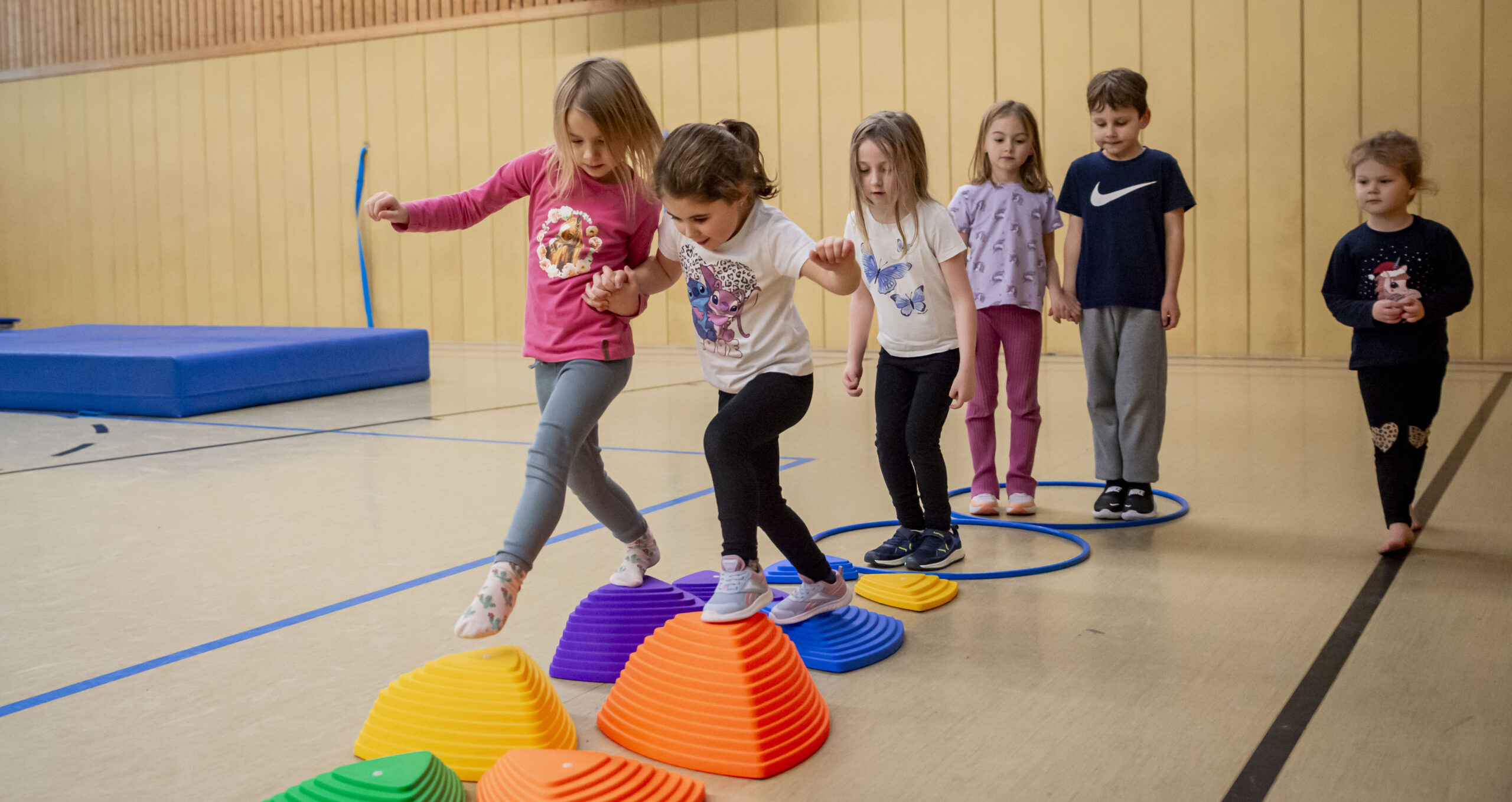 Sobald die Kinder krabbeln oder sogar schon richtig laufen können, sind sie bei uns ganz richtig. Hier können sie, durch Matten immer abgesichert, ihrem Bewegungsdrang und dem Wunsch nach kleinen Kletterpartien nachgehen. Immer dabei sind Trampolin, Reifen, Bälle und Kegel. Ansonsten bauen wir kleine Gerätelandschaften auf, die die Kinder spielerisch mit den Turngeräten vertraut machen und ihre Fähigkeiten zur Balance, Koordination und Konzentration fördern. Das Gruppengefühl wird durch den gemeinsamen Abbau, bei dem bereits die Kleinsten begeistert mithelfen, und das abschließende Singen von zwei bis drei Kinderliedern gebildet und gestärkt. Alles in allem haben die Kinder mit ihren Müttern / Vätern / Omas / Opas viel Spaß, erweitern ihre Fähig- und Fertigkeiten und erleben ein ganz neues Körpergefühl.